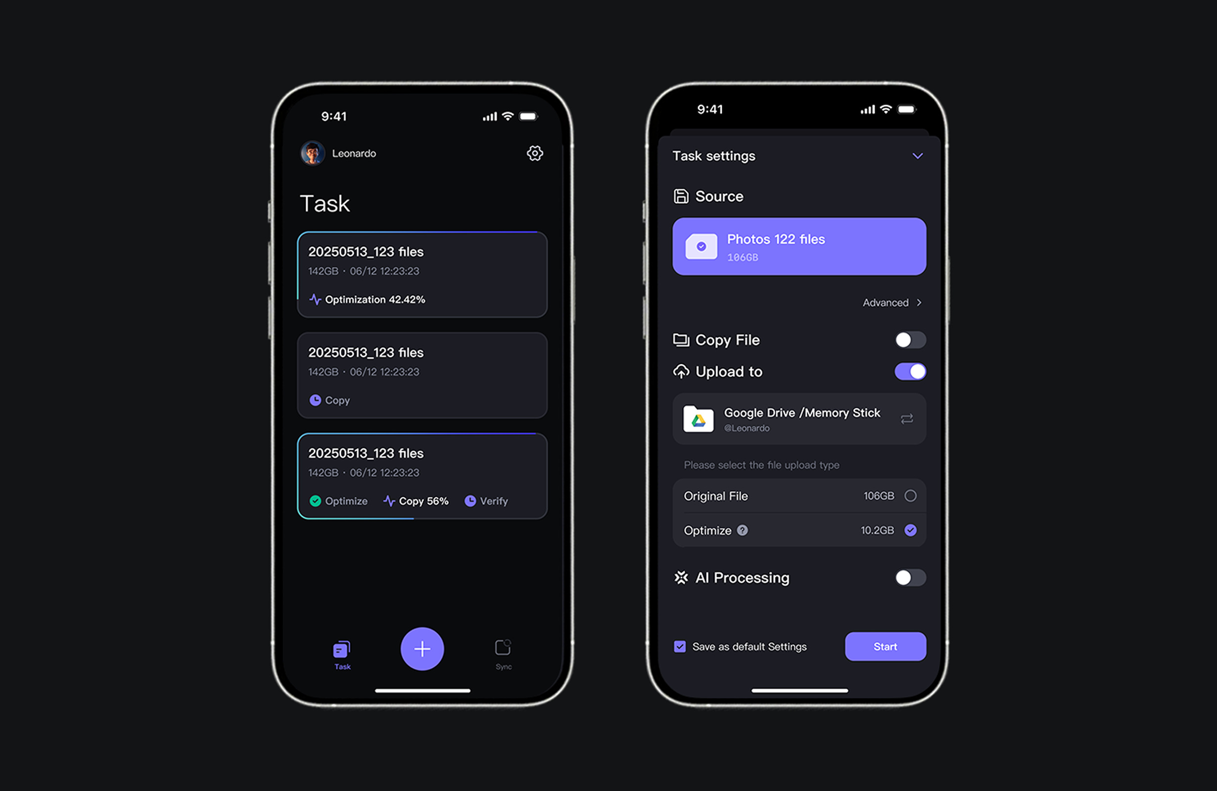 Back up phone, TF, or SD card data directly to SSD via App—no computer required. Choose to save original or transcoded files as needed. Secure local transfers work both online and offline.